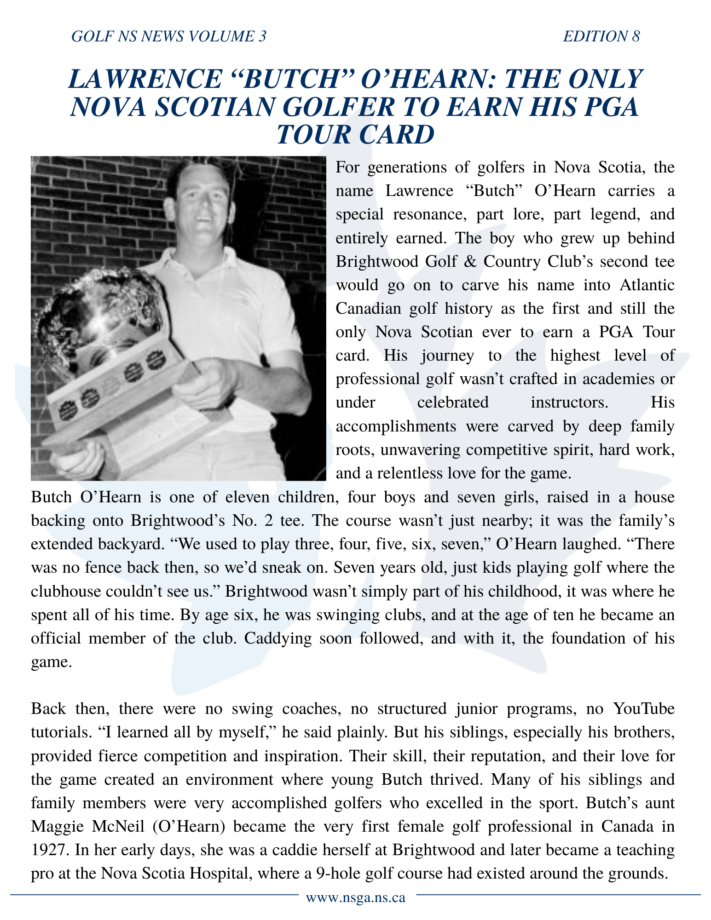 For generations of golfers in Nova Scotia, the name Lawrence “Butch” O’Hearn carries a special resonance, part lore, part legend, and entirely earned. The boy who grew up behind Brightwood Golf & Country Club’s second tee would go on to carve his name into Atlantic Canadian golf history as the first and still the only Nova Scotian ever to earn a PGA Tour card. His journey to the highest level of professional golf wasn’t crafted in academies or under celebrated instructors. His accomplishments were carved by deep family roots, unwavering competitive spirit, hard work, and a relentless love for the game.
