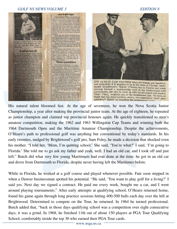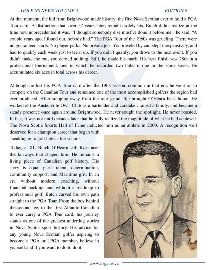 Today, at 81, Butch O’Hearn still lives near the fairways that shaped him. He remains a living piece of Canadian golf history. His story is equal parts talent, determination, community support, and Maritime grit. In an era without modern coaching, without financial backing, and without a roadmap to professional golf, Butch carved his own path straight to the PGA Tour. From the boy behind the second tee, to the first Atlantic Canadian to ever carry a PGA Tour card, his journey stands as one of the greatest underdog stories in Nova Scotia sport history. His advice for any young Nova Scotian golfer aspiring to become a PGA or LPGA member, believe in yourself and if you want to do it, do it.