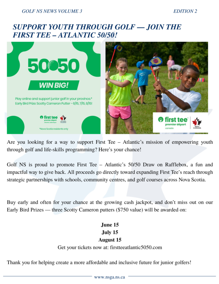Golf NS is proud to promote First Tee – Atlantic’s 50/50 Draw on Rafflebox, a fun and impactful way to give back. All proceeds go directly toward expanding First Tee’s reach through strategic partnerships with schools, community centres, and golf courses across Nova Scotia.