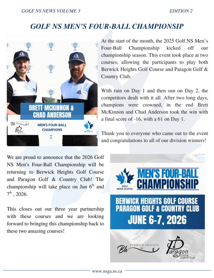 This past weekend the 2025 Golf NS Men’s Four-Ball Championship kicked off our championship season. This event took place at two courses, allowing the participants to play both Berwick Heights Golf Course and Paragon Golf & Country Club. With rain and Day 1 and then sun on Day 2, the competitors dealt with it all. After two long days, champions were crowned, in the end Brett McKinnon and Chad Anderson took the win with a final score of -16, with a 61 on Day 1, congratulations! Thank you to everyone who came out to the event and congratulations to all of our division winners!